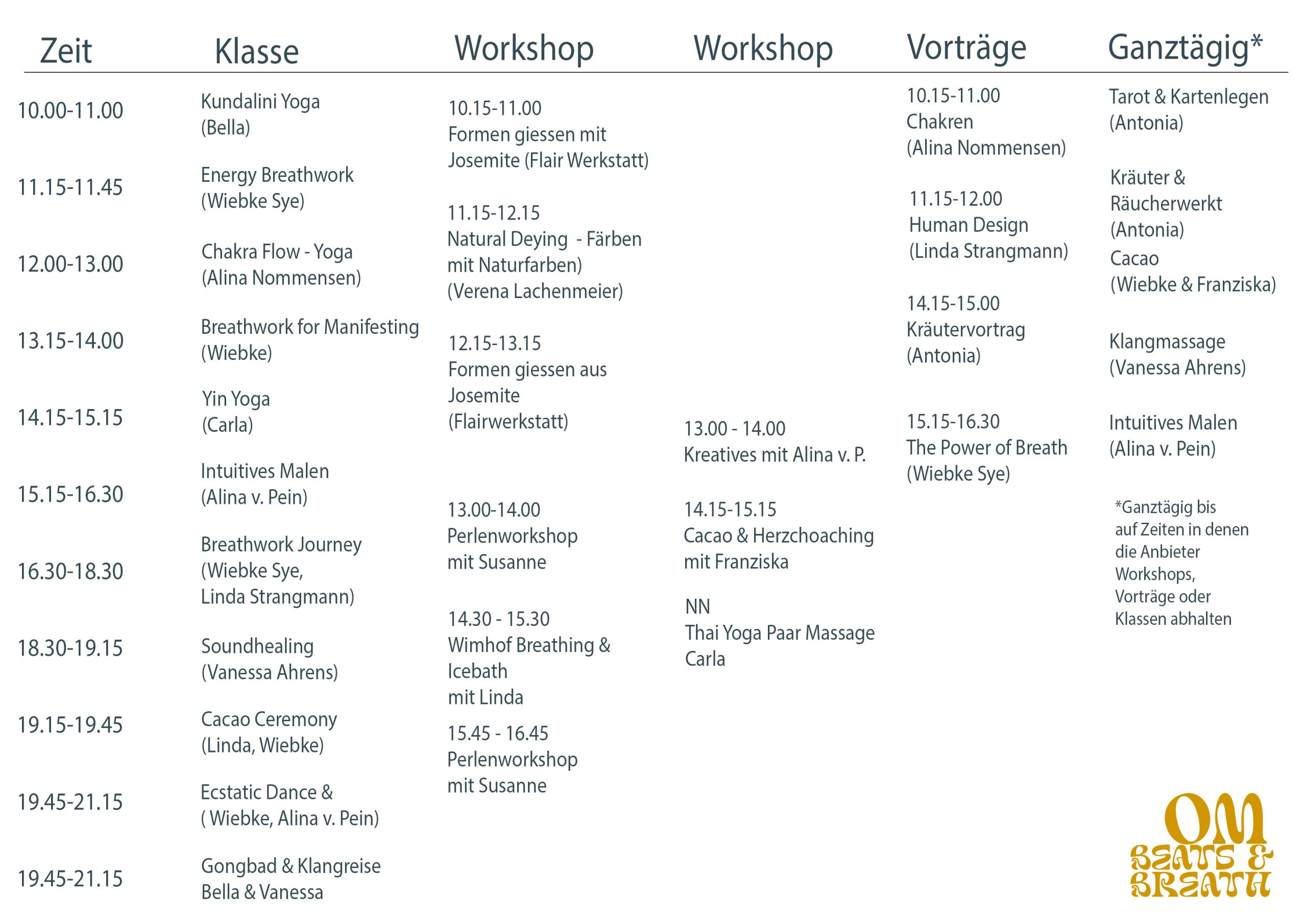Bitte beachte, dass noch jederzeit Änderungen im Programm entstehen können! Du stellst Dir Dein persönliches OM Beats & Breath Programm für Deinen Tag zusammen, bitte achte darauf, dass sich Deine Favoriten nicht mit andern Programmpunkten überschneiden.